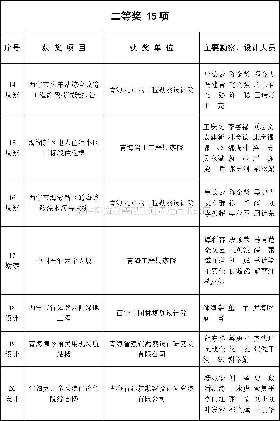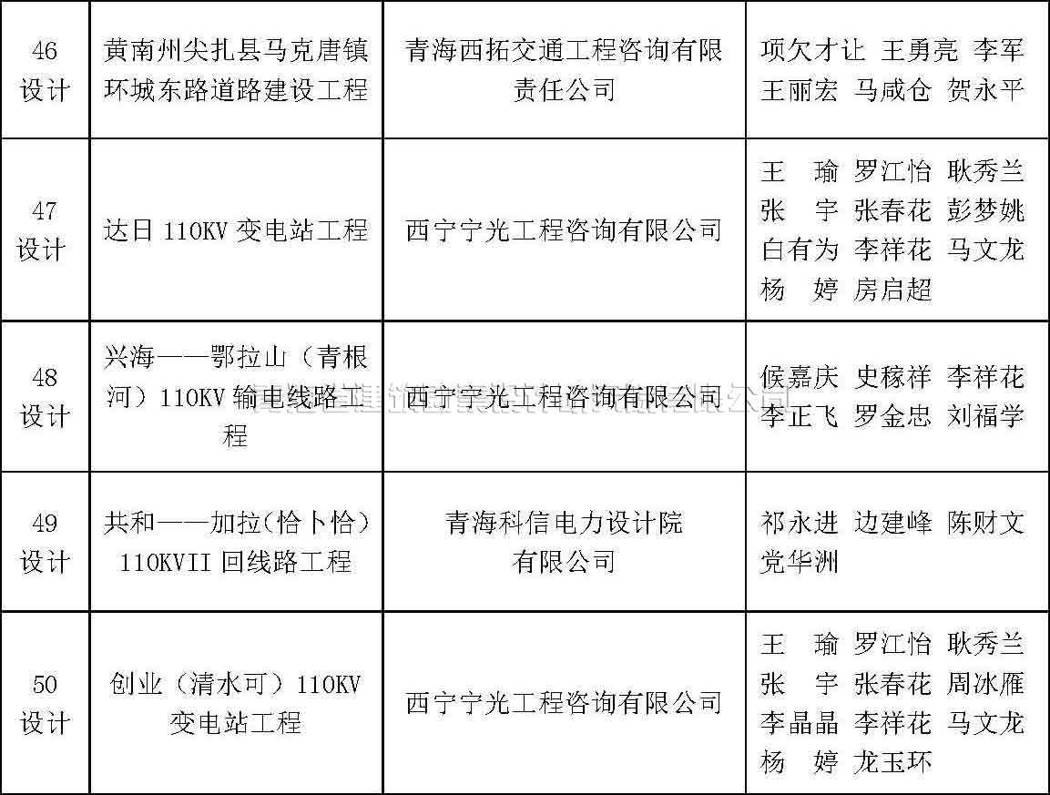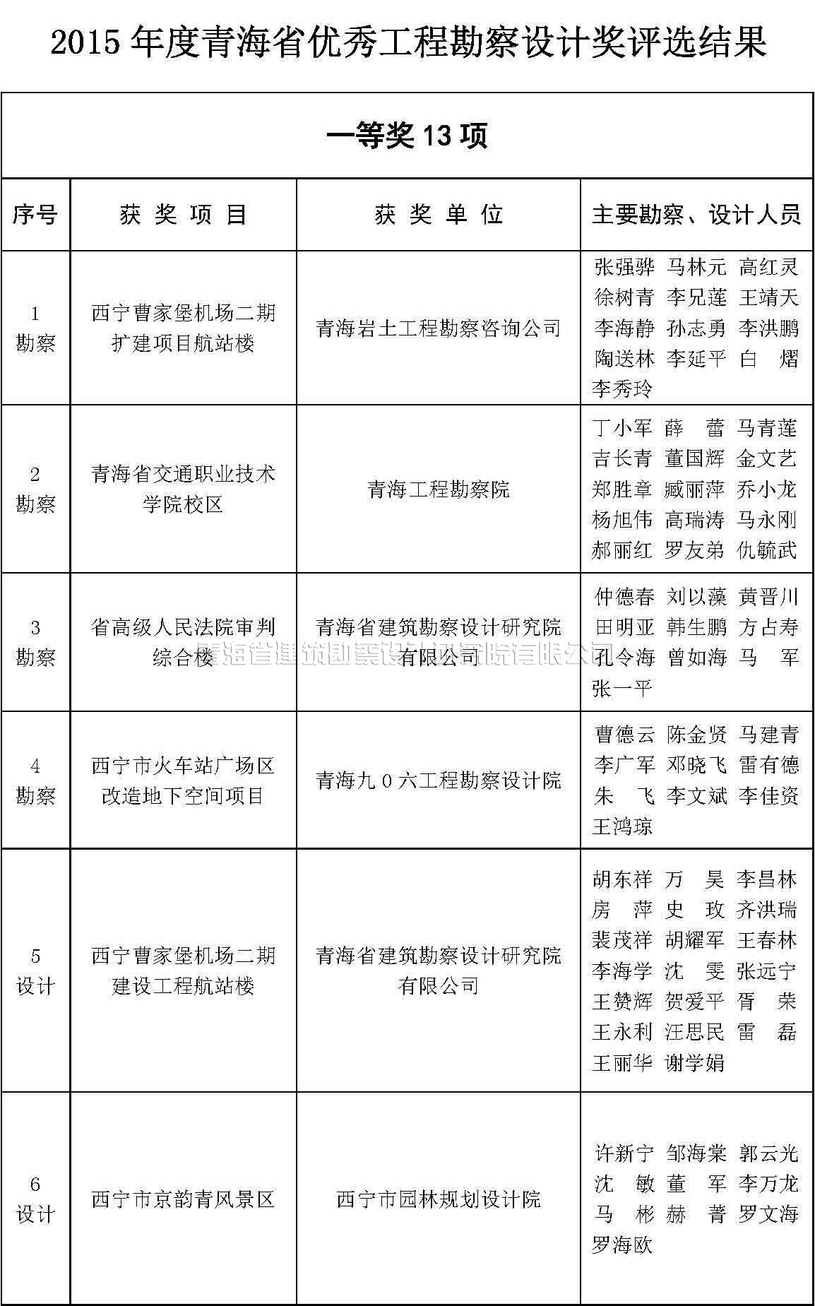 根據(jù)《青海省優(yōu)秀工程勘察設(shè)計(jì)獎評選辦法》(青建設(shè)[2011]534號,以下簡稱《評選辦法》)的規(guī)定,及中國勘察設(shè)計(jì)協(xié)會《關(guān)于評選2015年度全國優(yōu)秀工程勘察設(shè)計(jì)行業(yè)獎的通知》,我協(xié)會組織對2015年度青海省優(yōu)秀工程勘察設(shè)計(jì)獎進(jìn)行了評選。評選結(jié)果于7月15日在協(xié)會QQ群中進(jìn)行了公示,現(xiàn)予以公布。