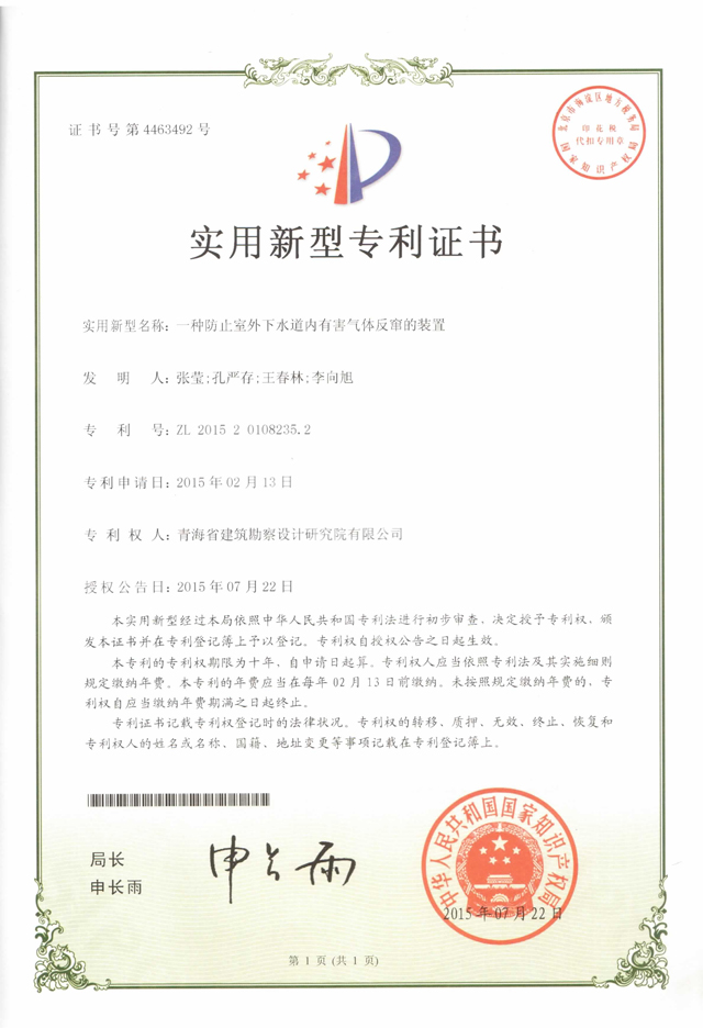 一種防止室外下水道內有害氣體反竄的裝置(發明人:王春林、李向旭、孔嚴存、張瑩)